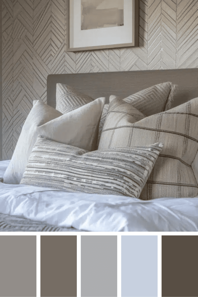 This room utilizes a beautiful chevron-patterned wallpaper or paneling to add subtle movement to the walls. A mix of striped and plaid pillows in neutral tones creates a “mixed-print” look that still feels cohesive because of the color palette.