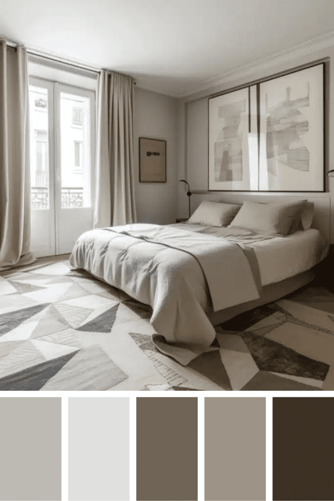 This striking room features a large geometric rug in shades of gray, beige, and chocolate brown that acts as a piece of floor art. The bed is kept very simple with a flat-fold duvet to allow the rug and the oversized abstract art to take center stage.