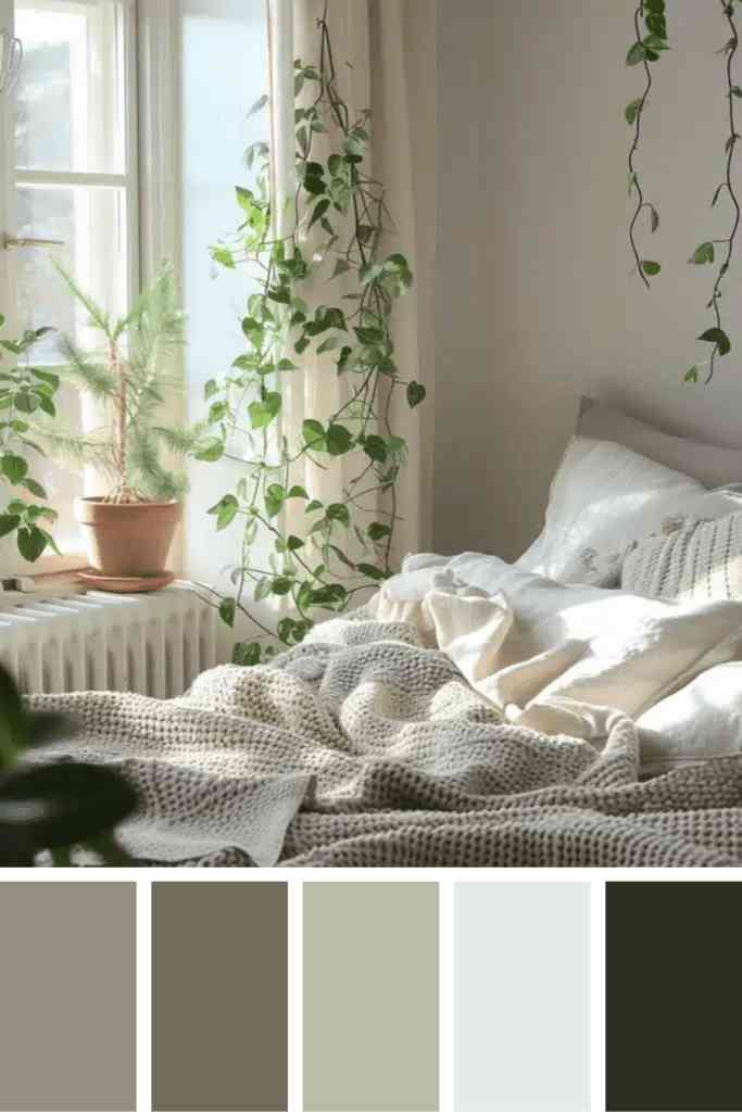 This room brings the outside in with trailing ivy and potted plants set against a backdrop of soft gray knit blankets. The natural green of the plants pops beautifully against the neutral bedding and the bright window light.
