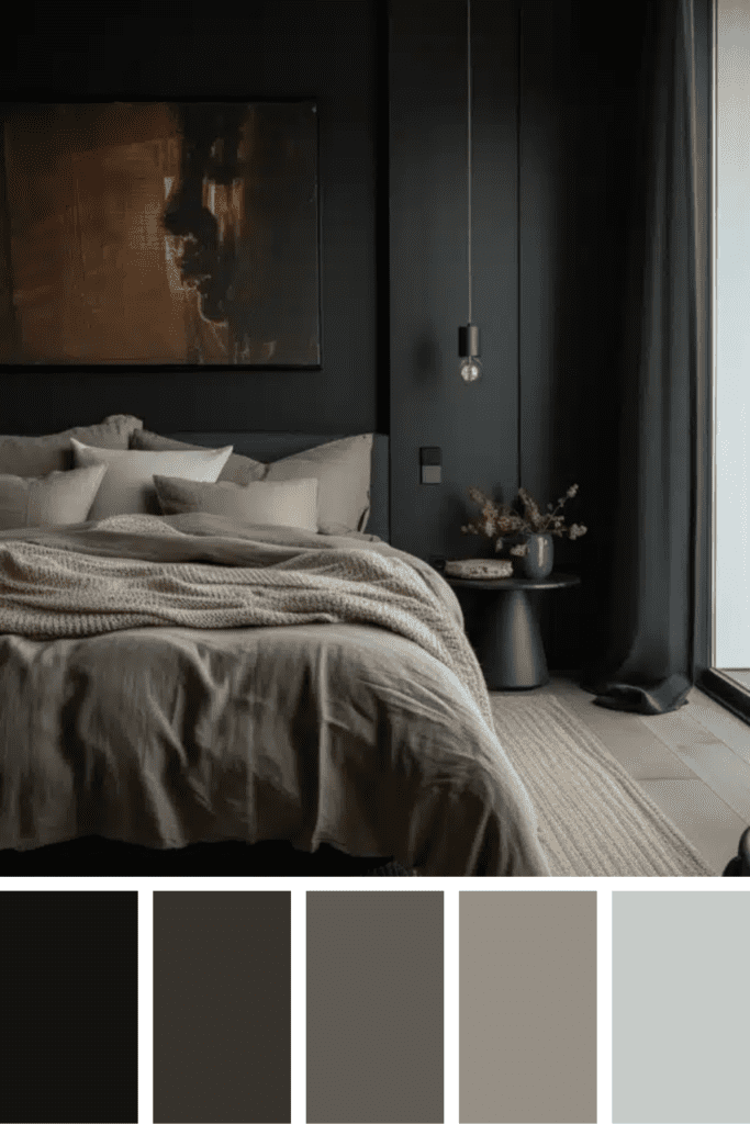 The contrast between the light wood flooring and the moody walls provides a high-end, contemporary feel. This space radiates a cocoon-like energy that is perfect for anyone who loves a dark, cozy sanctuary for sleeping.
