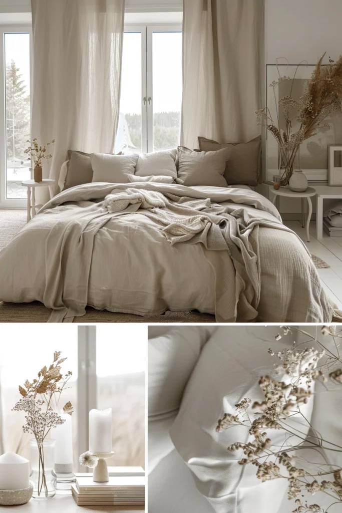 This light-filled sanctuary uses thin, breezy curtains and a low bed to create a relaxed, Scandi-inspired retreat. Dried florals and simple candles on low tables bring a touch of nature indoors without the maintenance of live plants.