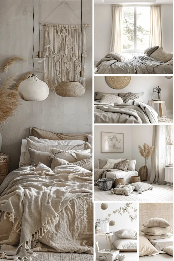 This collage shows how to use macramé wall hangings, woven baskets, and pampas grass to create a boho-chic gray and beige bedroom. The use of mismatched pendant lights and textured floor pillows adds a playful, lived-in charm.