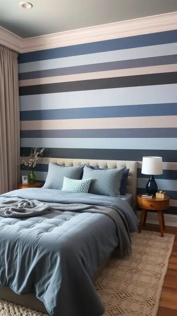 The wall behind the bed features wide, horizontal stripes in alternating shades of navy, slate grey, light blue, and cream. The bed is dressed in a heavy blue-grey quilted duvet, and a textured tan rug covers the floor. The horizontal stripes make the room feel much wider than it actually is, while the varying colors provide a built-in palette for the rest of the decor. This creates a fun, rhythmic energy that is perfect for a guest room or a teenager’s bedroom. If you try this, make sure your stripes are wide (at least 10-12 inches) to keep the look modern rather than busy.