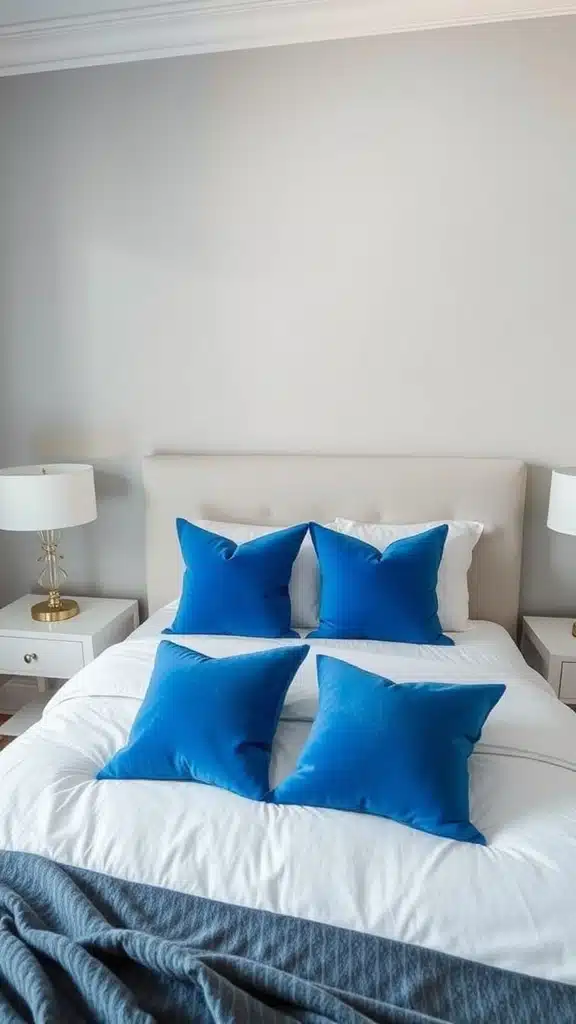 Four plush, electric blue velvet pillows are arranged neatly on a crisp white bed, standing out sharply against a pale grey wall. The bed features a simple beige headboard, and matching white nightstands with glass and gold lamps flank the sleeping area. The use of velvet adds a rich, reflective quality to the blue that makes it feel much more expensive than standard cotton. The mood is clean, bright, and edited, perfect for someone who loves a minimalist look with a punch of color. Switching out your pillow covers is the fastest and cheapest way to change the vibe of your bedroom.