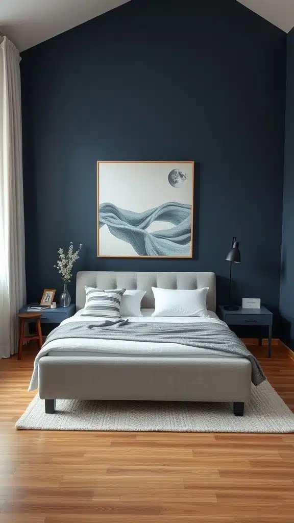 This dramatic room features dark navy walls and a large square art piece showing stylized blue mountains under a moon. The bed is a medium grey fabric with a striped accent pillow, and the warm wood floors add a much-needed organic element to the cool palette. The deep walls make the white bedding and white flowers on the nightstand glow. This creates a mysterious and deeply relaxing energy, almost like being in a cozy cabin at twilight. Darker walls like these are amazing for people who need a very dark environment to fall asleep easily.