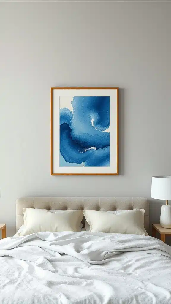 A large, vertical framed print featuring an abstract blue watercolor swirl hangs centered over a simple tufted headboard. The walls are a soft, warm grey, and the bedding is a clean, rumpled white linen that looks incredibly inviting. The art serves as a “color map” for the room, pulling in various shades of ocean and sky blue without needing any other decor. It creates a meditative and calm atmosphere that is very conducive to relaxation. When hanging art, aim to have the center of the piece at eye level for the best visual impact.