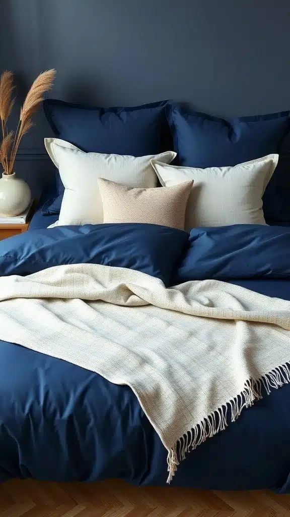 This close-up shows a bed layered with deep navy blue duvet covers and matching pillows, accented by cream-colored textured cushions and a fringed throw blanket. The wall behind the bed is a dark, moody blue that blends seamlessly with the linens for a monochromatic look. This design works by using different textures like cotton, knit, and pampas grass to keep the dark colors from looking flat. It creates a cocoon-like feeling of total luxury and warmth that is perfect for cold winter nights. Don’t be afraid to mix different shades of the same blue to add depth to your bedding.