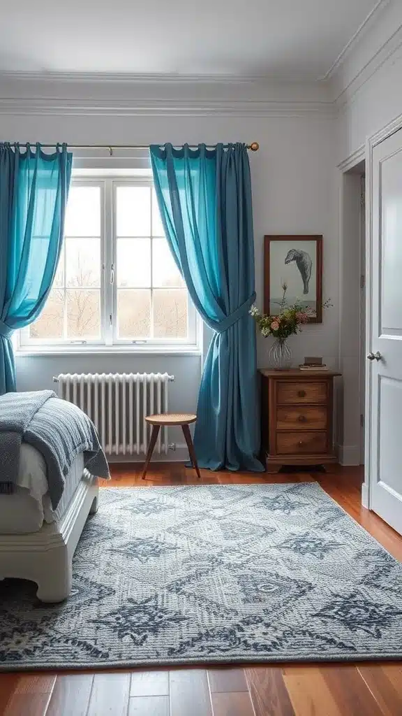 This bright and airy room showcases beautiful teal blue sheer curtains that allow natural light to filter through, casting a soft glow over the space. The walls are a very pale grey, and a patterned rug in various shades of blue and white grounds the room. The design works because the lightness of the fabric prevents the blue from feeling too heavy or dark in a smaller space. There is a breezy, coastal energy here that feels incredibly refreshing and peaceful for a morning person. For a similar look, choose a curtain rod in a warm wood tone to add a bit of organic contrast.