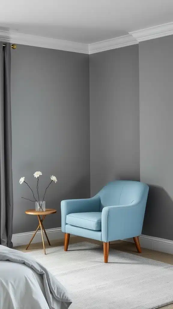 A cozy corner is defined by deep slate grey walls and a plush sky blue armchair that invites you to curl up with a book. A minimalist wooden tripod side table sits nearby with a simple vase of white flowers, all resting on a light grey area rug. The dark walls make the light blue upholstery pop, creating a perfect balance of light and shadow. The mood is intimate and quiet, making it the perfect little “me time” nook away from the rest of the house. Painting your walls a darker grey can actually make a small room feel cozier rather than smaller.