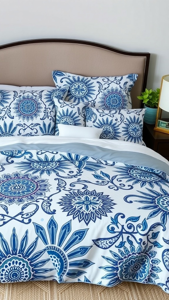 A tan upholstered headboard provides a neutral backdrop for a vibrant display of blue and white floral patterned bedding. The duvet and matching shams feature large, intricate sunburst and vine motifs in various shades of cobalt and azure. The stark white background of the fabric keeps the busy pattern feeling clean and organized rather than chaotic. This creates a cheerful, high-energy mood that feels classic yet bold at the same time. If you love patterns, keep the surrounding walls and furniture neutral to let the bedding be the star of the show.