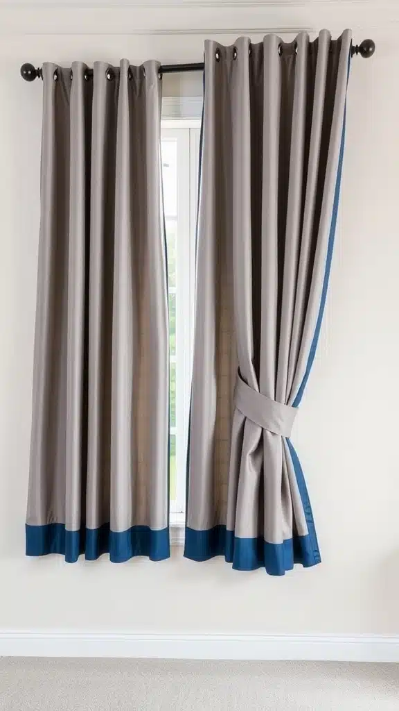 These sophisticated curtains feature a main body of shimmering taupe-grey fabric finished with a thick border of deep teal blue along the bottom and sides. They are hung on a dark bronze rod with simple grommets, framed against a light cream-grey wall. The blue border acts as a visual “weight,” drawing the eye down and making the ceilings feel taller. The feeling is very formal and polished, reminiscent of a luxury hotel suite. This is a great way to introduce blue if you are hesitant to commit to a full blue wall or rug.