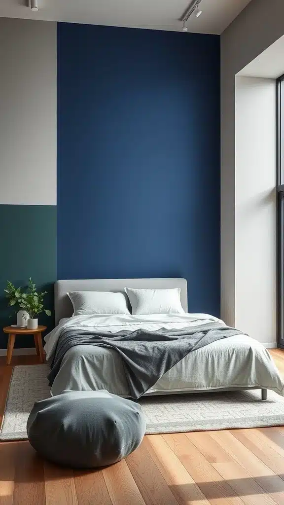 This striking design features a deep navy blue rectangle painted directly behind the bed, framed by a soft grey on one side and a dark forest green on the other. The bed is kept simple with a light grey upholstered headboard and crisp white linens topped with a textured charcoal throw. It works visually because the sharp lines of the color blocking create a modern, architectural feel without needing expensive furniture. The mood is sophisticated and grounded, offering a sense of structured calm that feels very intentional. To try this yourself, use painter’s tape to create a crisp vertical border for your boldest color.