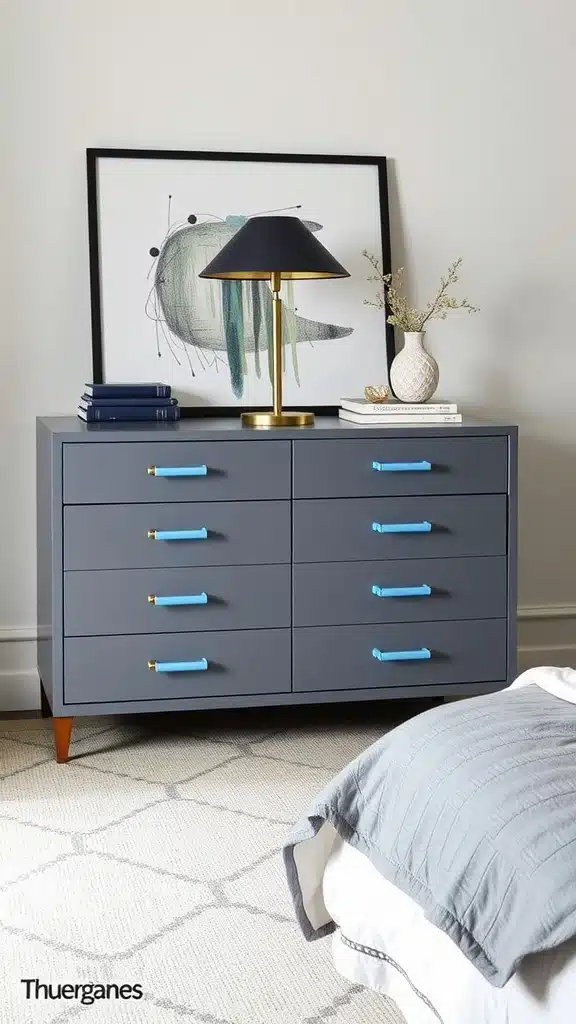 A sleek slate grey dresser sits on a geometric patterned rug, featuring unique bright blue handles that add a playful touch. On top, a gold lamp with a black shade sits next to a stack of blue books and a white textured vase. The contrast between the serious grey furniture and the whimsical blue hardware is what makes this piece so successful. It creates a creative and modern vibe that feels youthful and fresh. You can easily recreate this by painting the handles of a grey dresser you already own with a bright blue sample pot.
